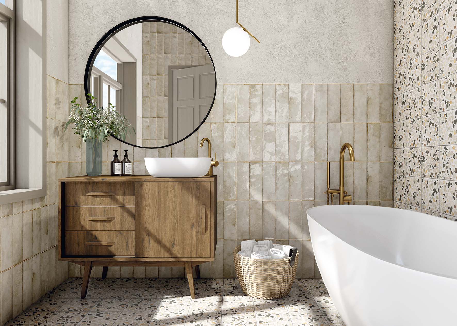 La serie de azulejos para baño y cocina revestimiento Alboran de Mainzu consta de una gama de cuatro tonos desgastados con múltiples variantes en su gráfica para evitar repeticiones.