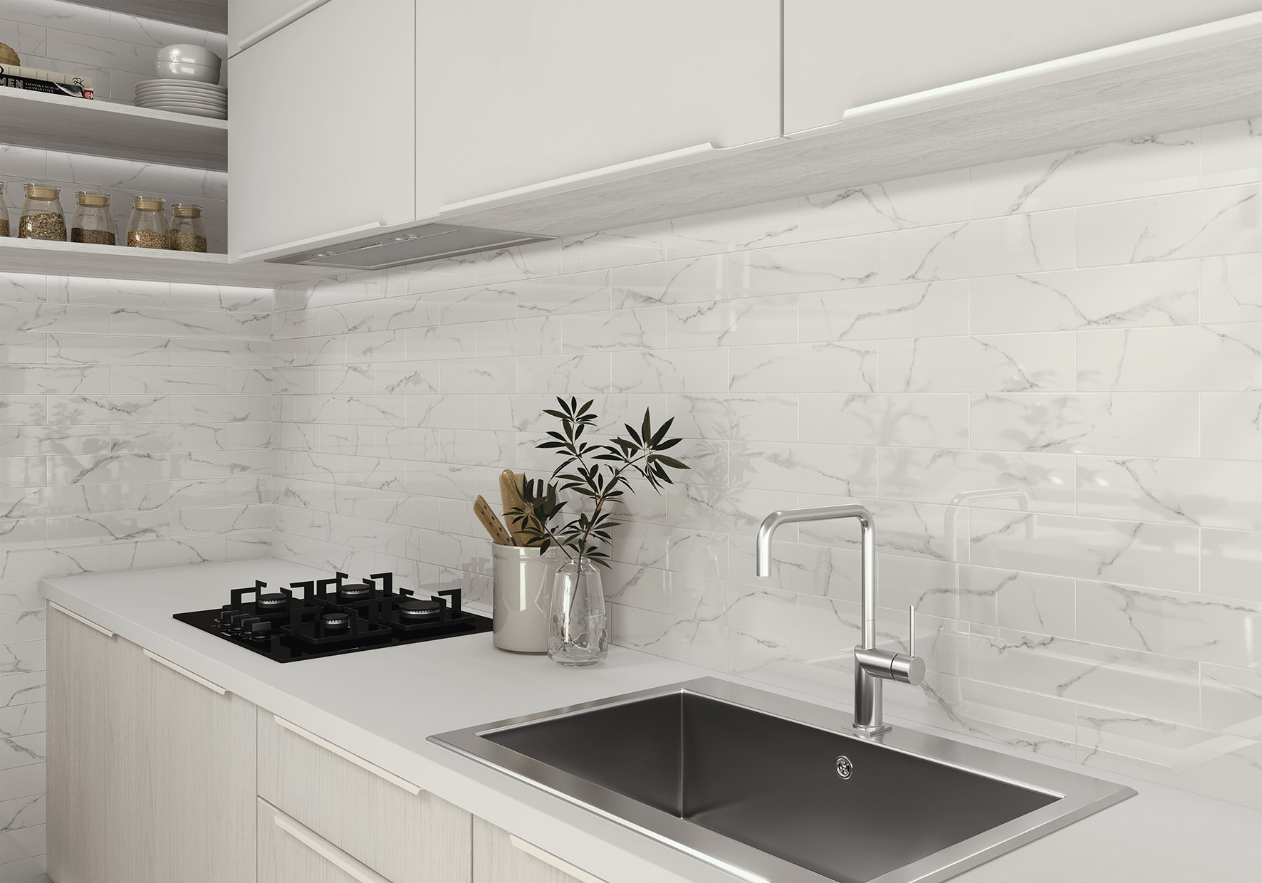 Arpa blanco es una inmejorable opción de azulejo de pasta blanca disponible en acabado mate o brillo y con un formato de 7,5×30 cm. Este azulejo de imitación mármol destaca por sus vetas suaves y elegantes, las cuales se presentan en 33 caras diferentes, garantizando la ausencia de repeticiones en el patrón gráfico.