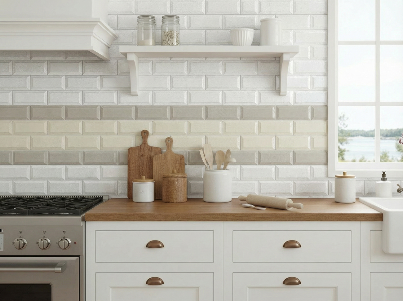 El bisel perimetral de cada pieza crea un juego de sombras muy característico, aportando textura y dinamismo a las paredes. Combinado con el efecto craquelé, el resultado es un revestimiento con personalidad, perfecto para cocinas, baños, aseos, frentes de encimera o paredes decorativas.