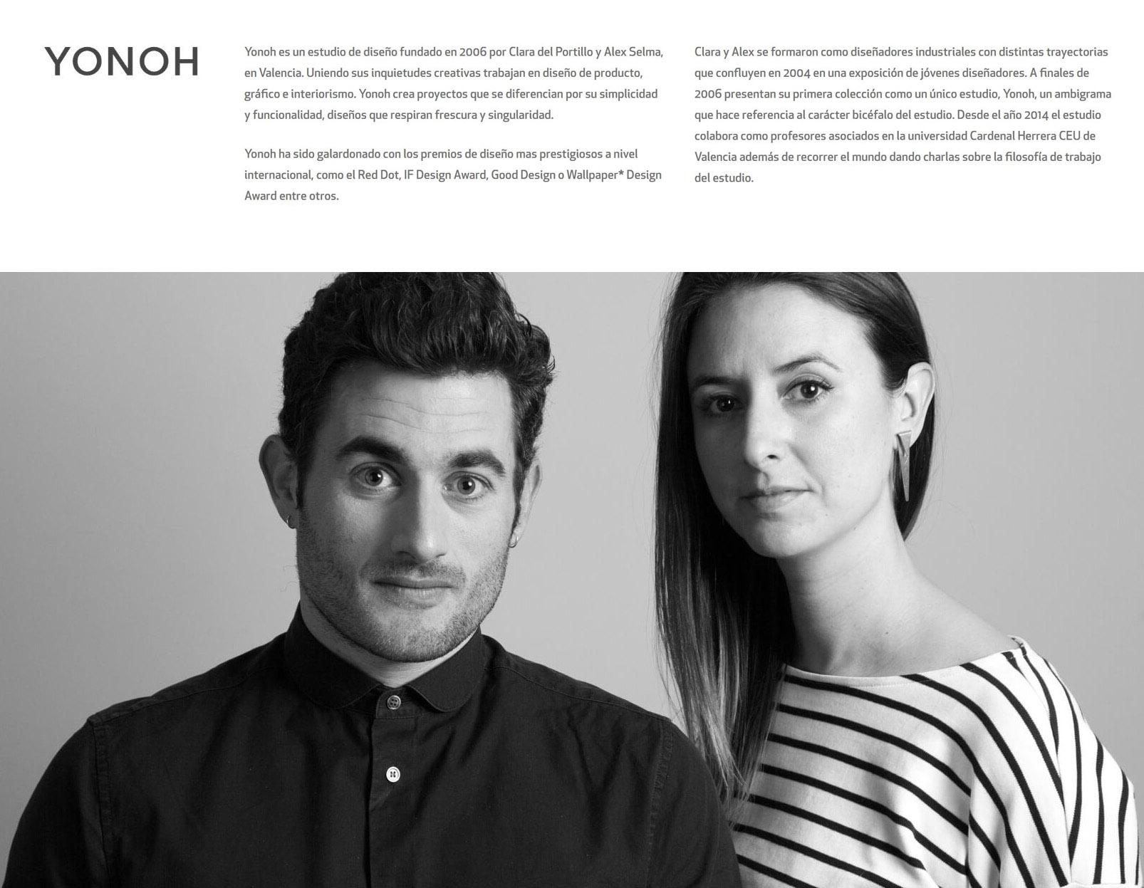 Clara y Alex se conocieron como diseñadores industriales en 2004, convergiendo en una exposición de jóvenes talentos. A partir de esa conexión, en 2006, presentaron su primera colección bajo el nombre de Yonoh, un ambigrama que refleja la dualidad y complementariedad en su enfoque creativo. Desde 2014, además de sus proyectos, colaboran como profesores asociados en la Universidad Cardenal Herrera CEU de Valencia y comparten su filosofía de trabajo en conferencias por todo el mundo.