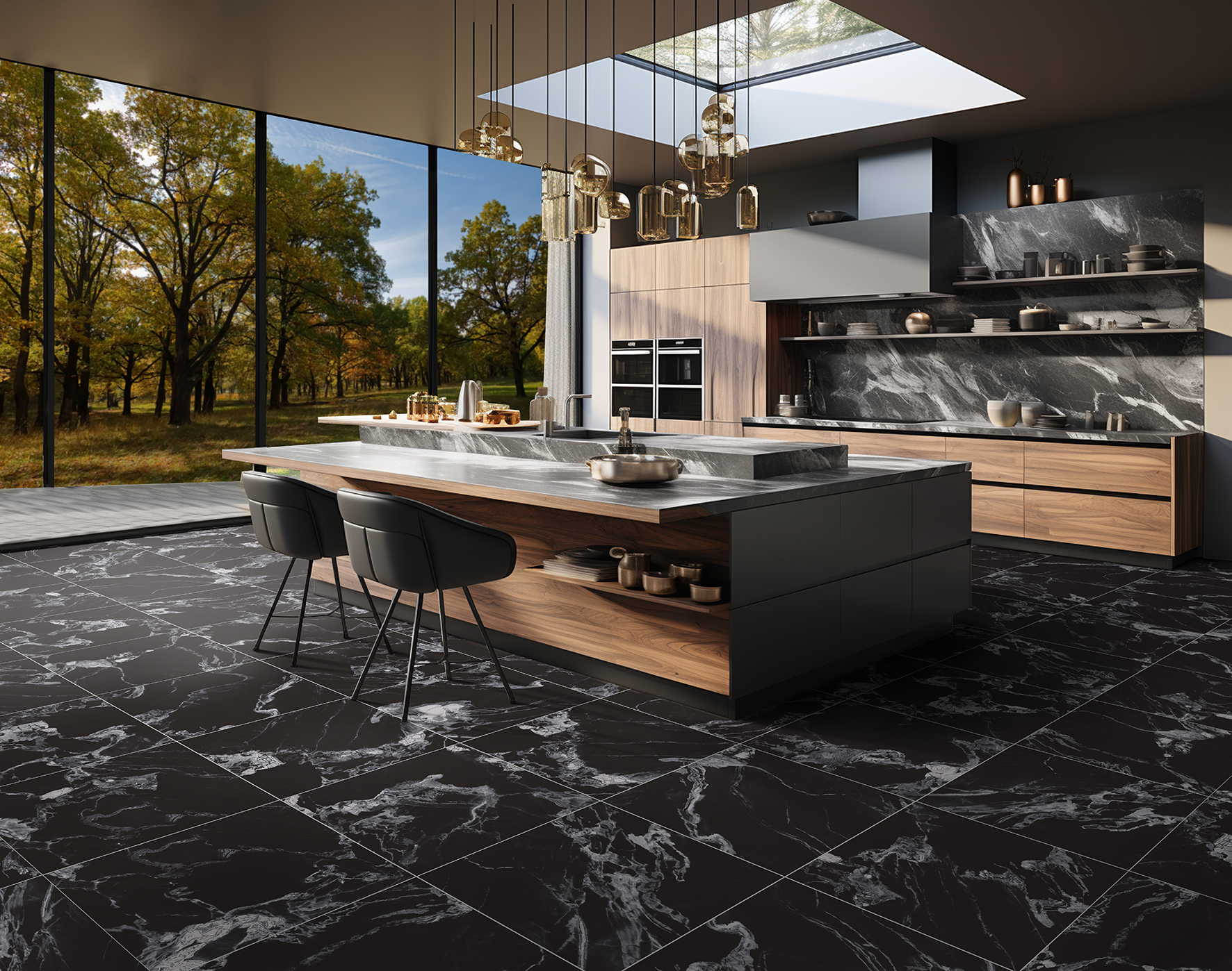 Ambos acabados permiten coordinar suelos y paredes, manteniendo una coherencia visual entre todos los planos del espacio. El tono oscuro y el diseño marmoleado hacen que Broussard Negro encaje perfectamente en estilos como el clásico renovado, industrial elegante, moderno con contrastes o minimalismo con texturas.