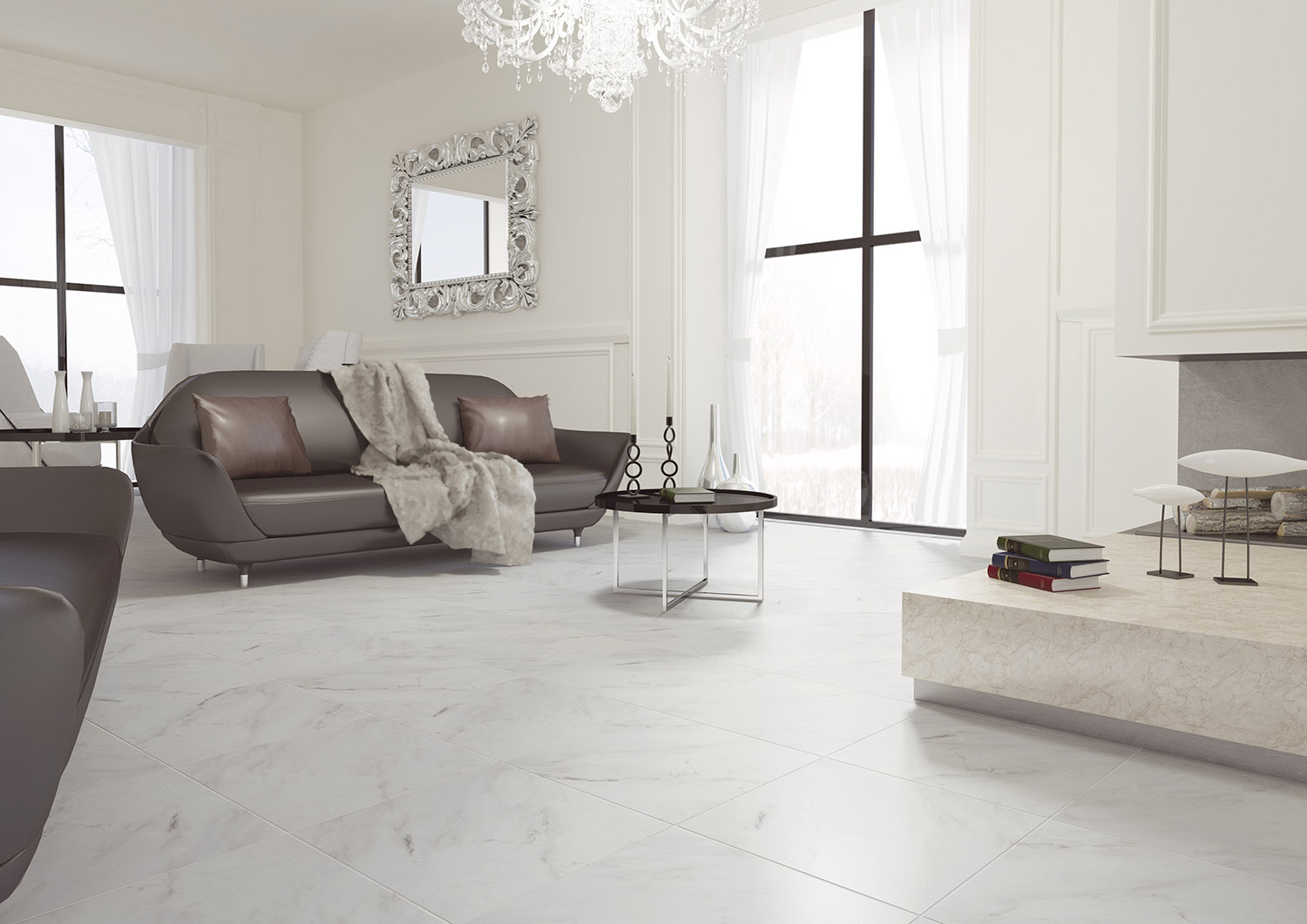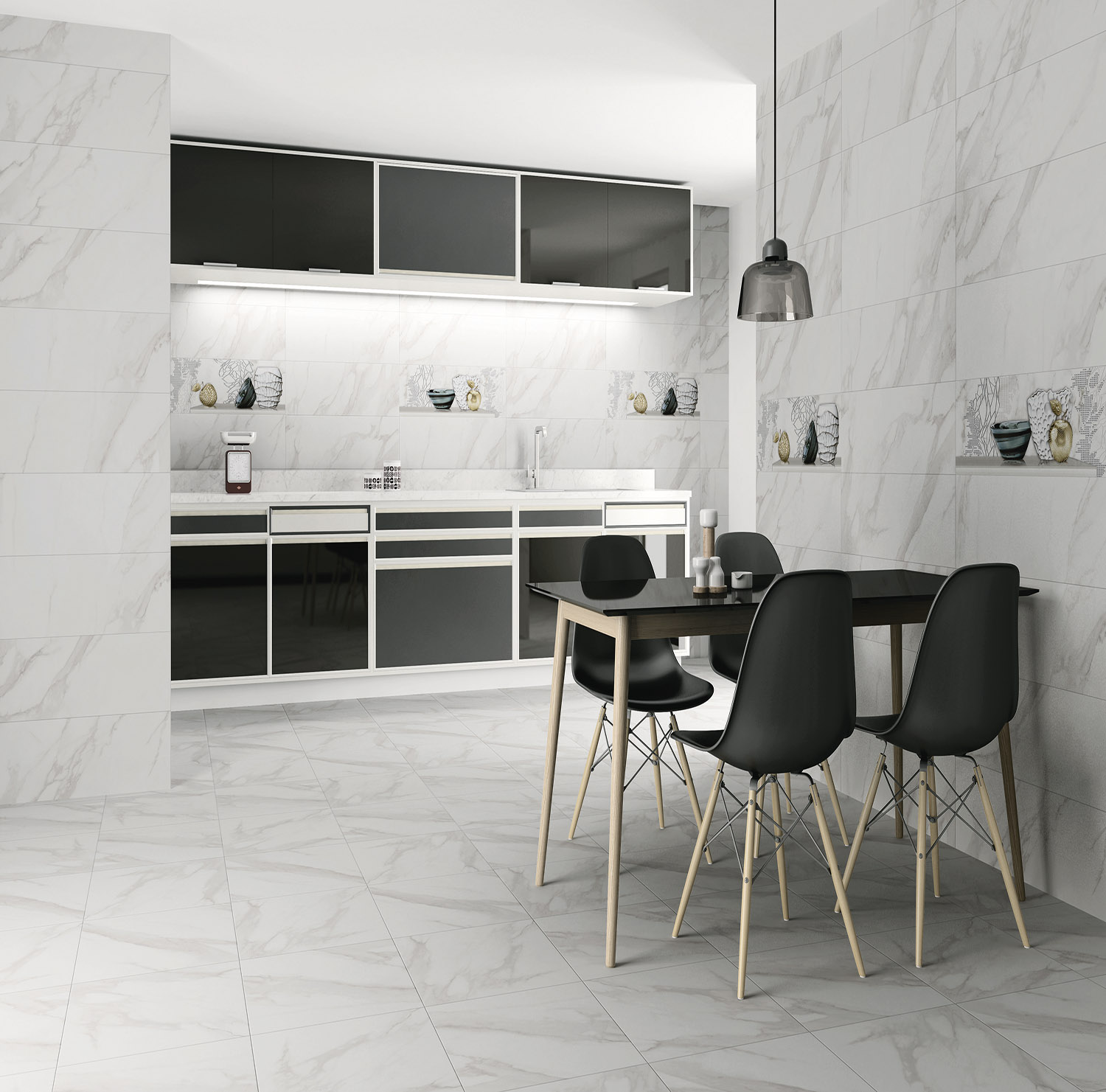 Serie de pavimento imitación mármol calacatta mate aportando un toque de elegancia atemporal a tu espacio tanto para baños, cocinas como salones.
