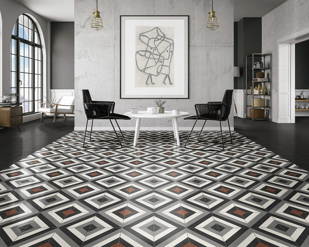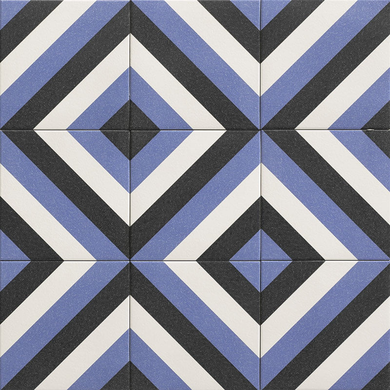 Serie de azulejos hidráulicos en porcelánico mate con motivos geométricos que puede combinarse con la base Riga a juego.