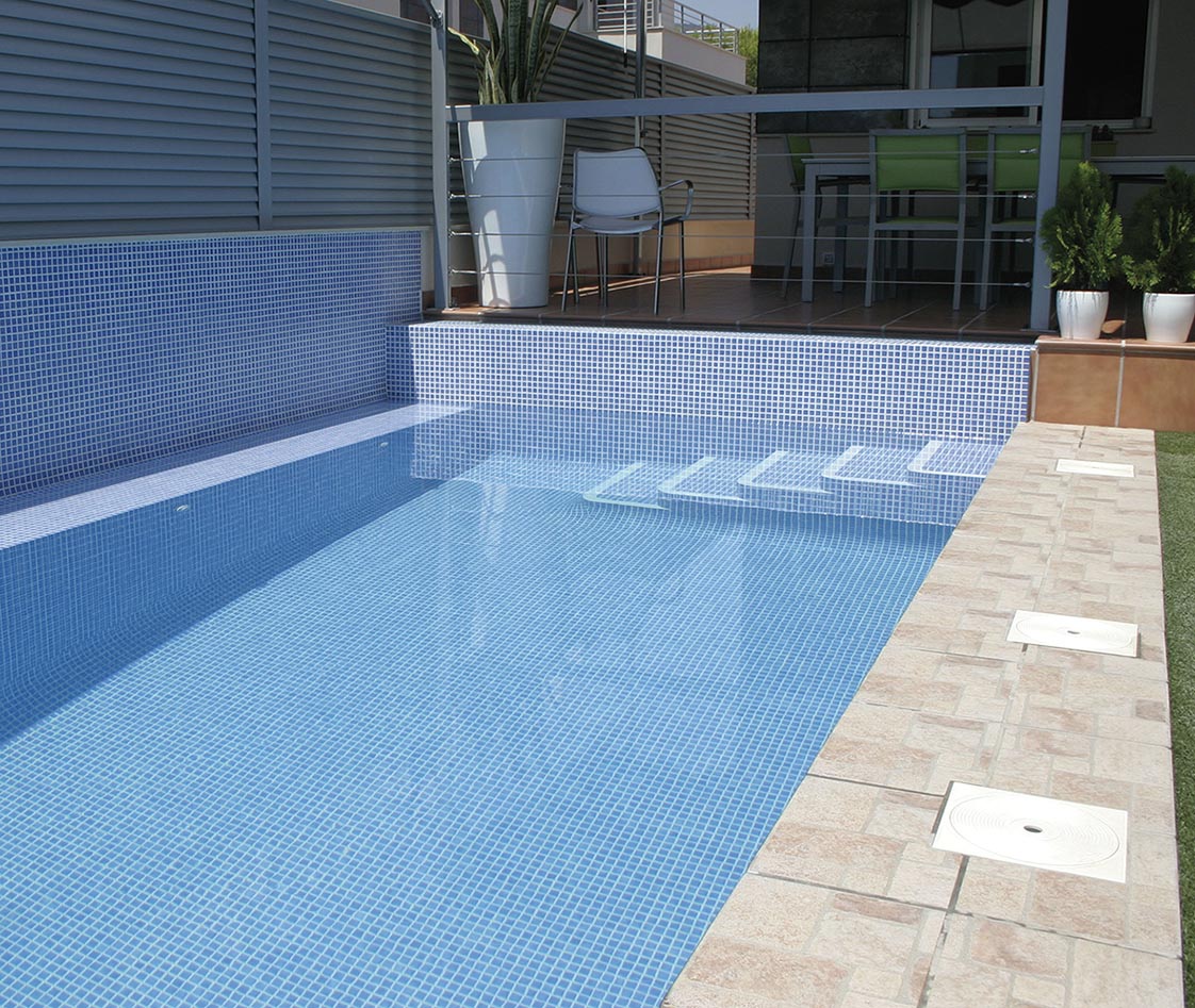 Serie de gresite monocolor en mosaico sobre malla en varios tonos a elegir. Ideal para recubrir todo tipo de espacios en zonas húmedas como piscinas, baños (especialmente en la zona de la ducha) o spas. Al ser una malla de teselas puede adaptarse a todo tipo de formas curvas en piscinas , pilares cilíndricos, etc.