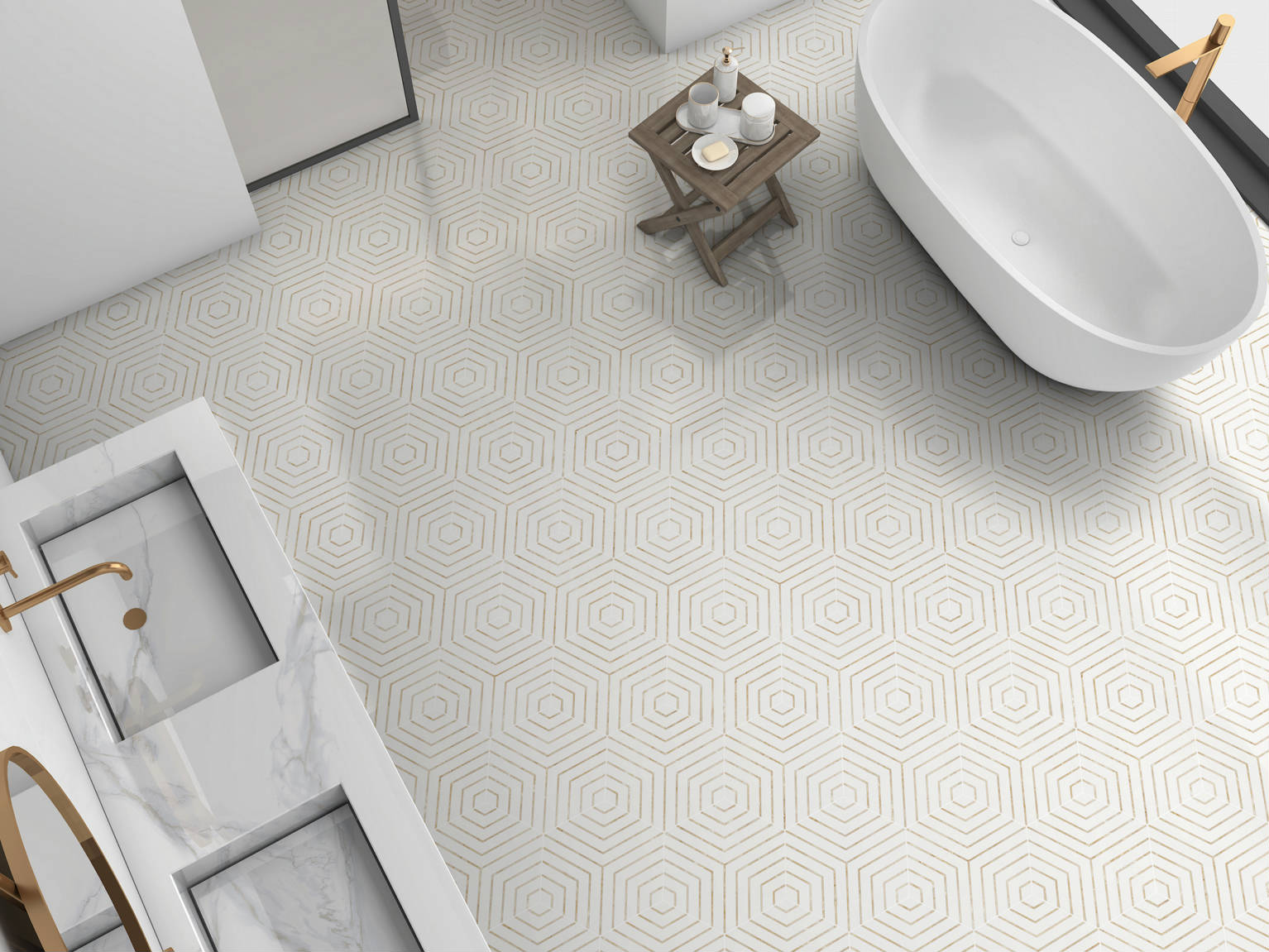 Al ser un azulejo no rectificado, Hexa Venezia Oro se instala con juntas visibles que complementan su forma hexagonal, destacando el patrón y el diseño del conjunto. Esta característica añade un toque artesanal y auténtico al revestimiento, perfecto para crear superficies que capten la atención con elegancia.