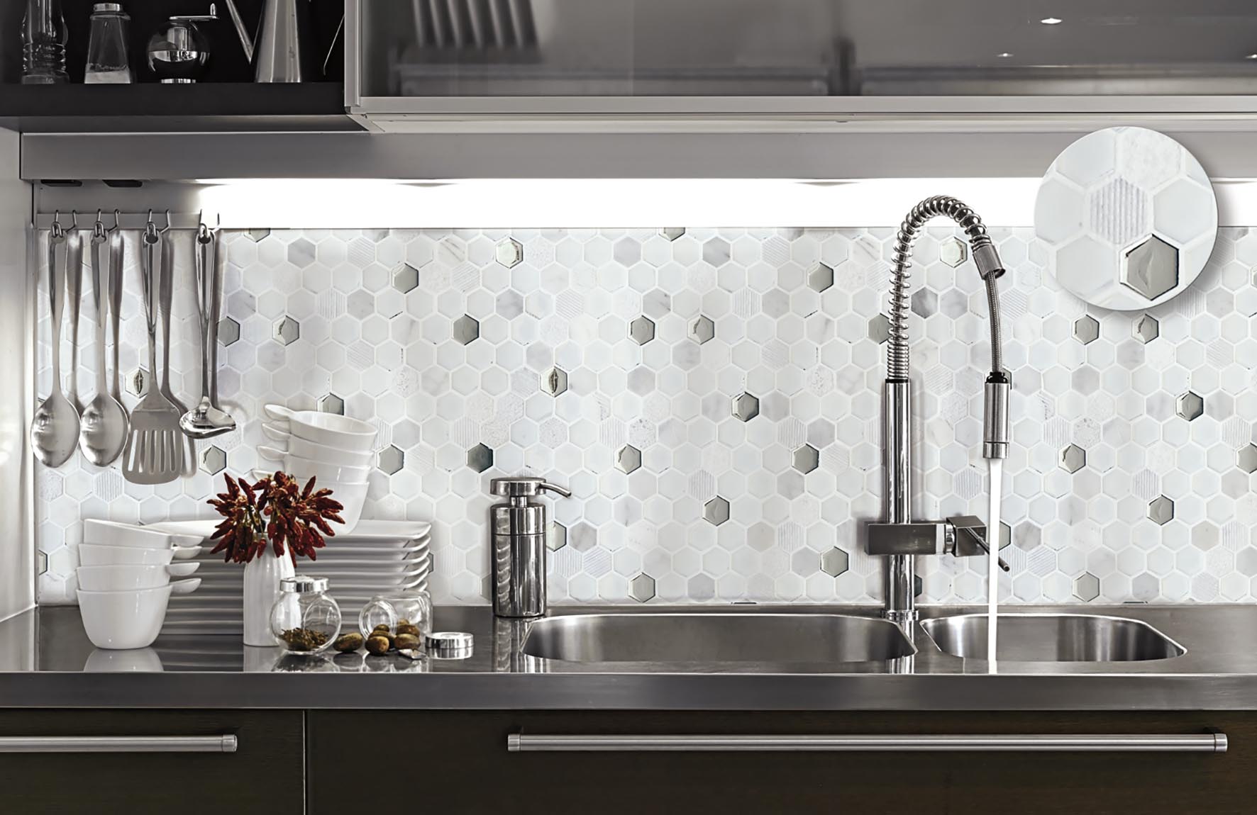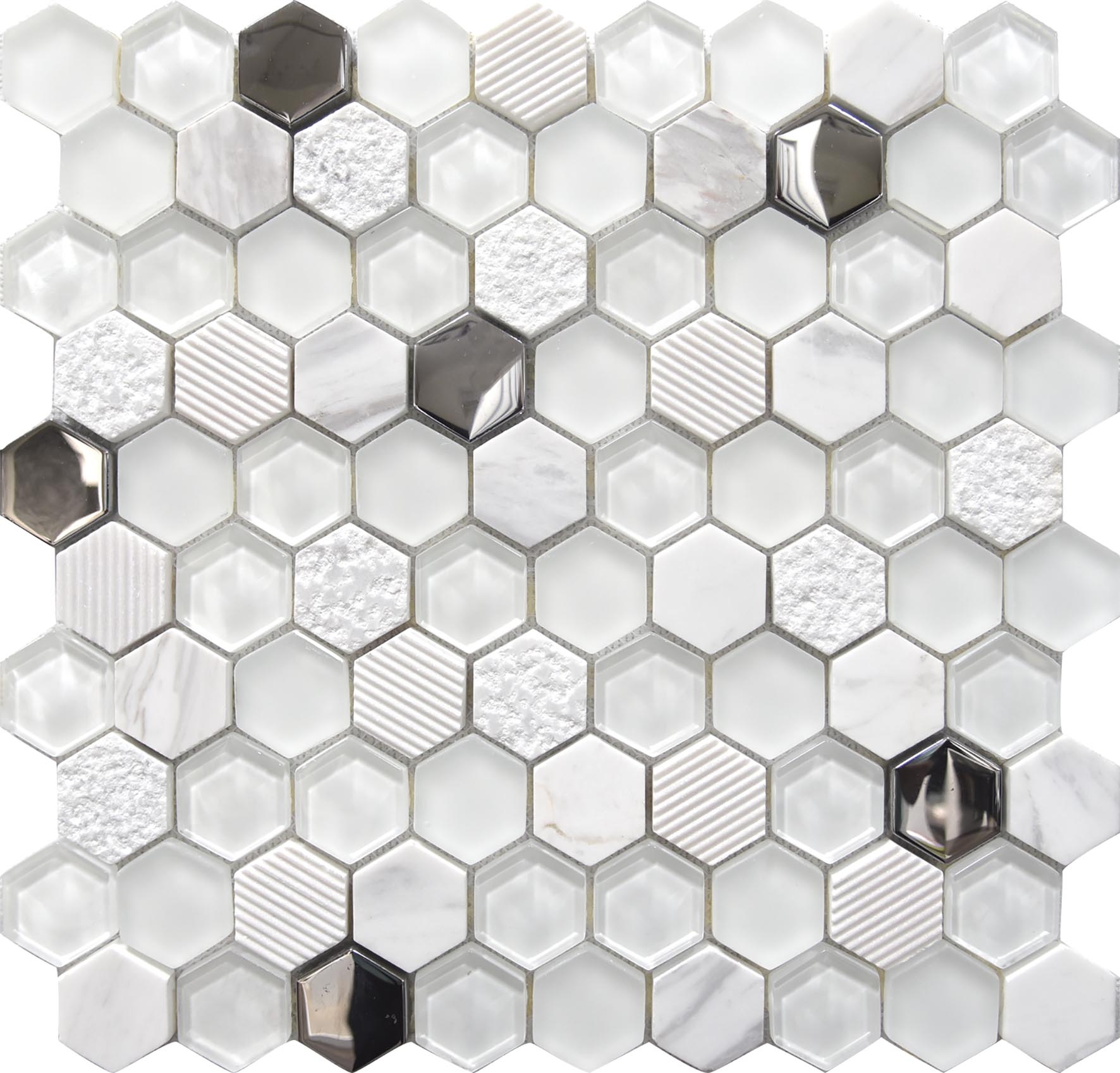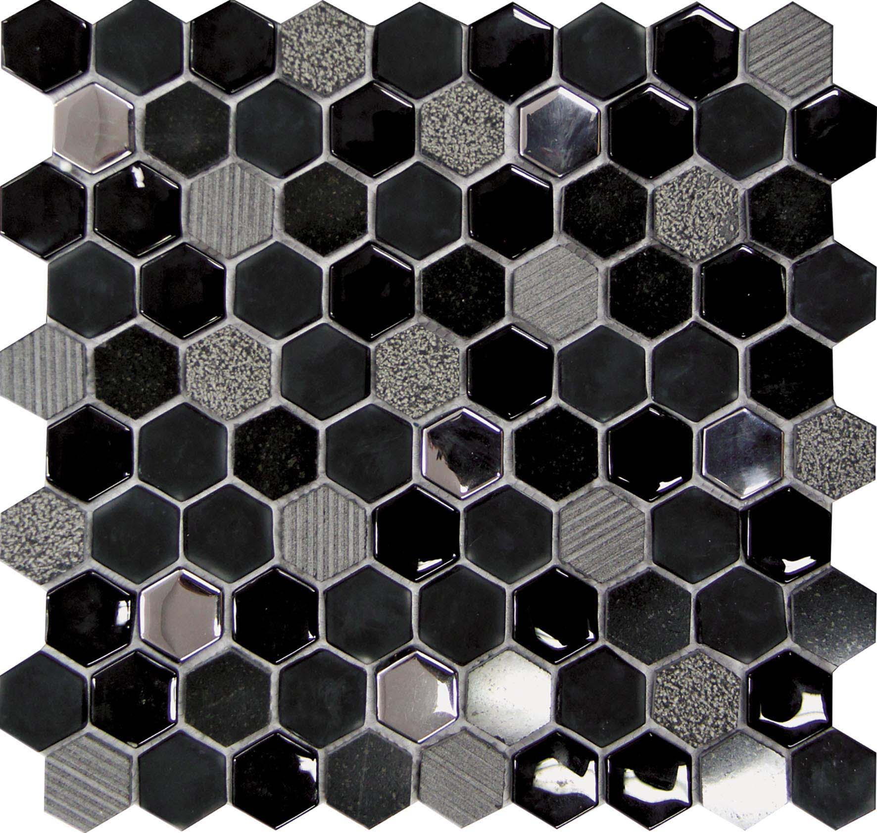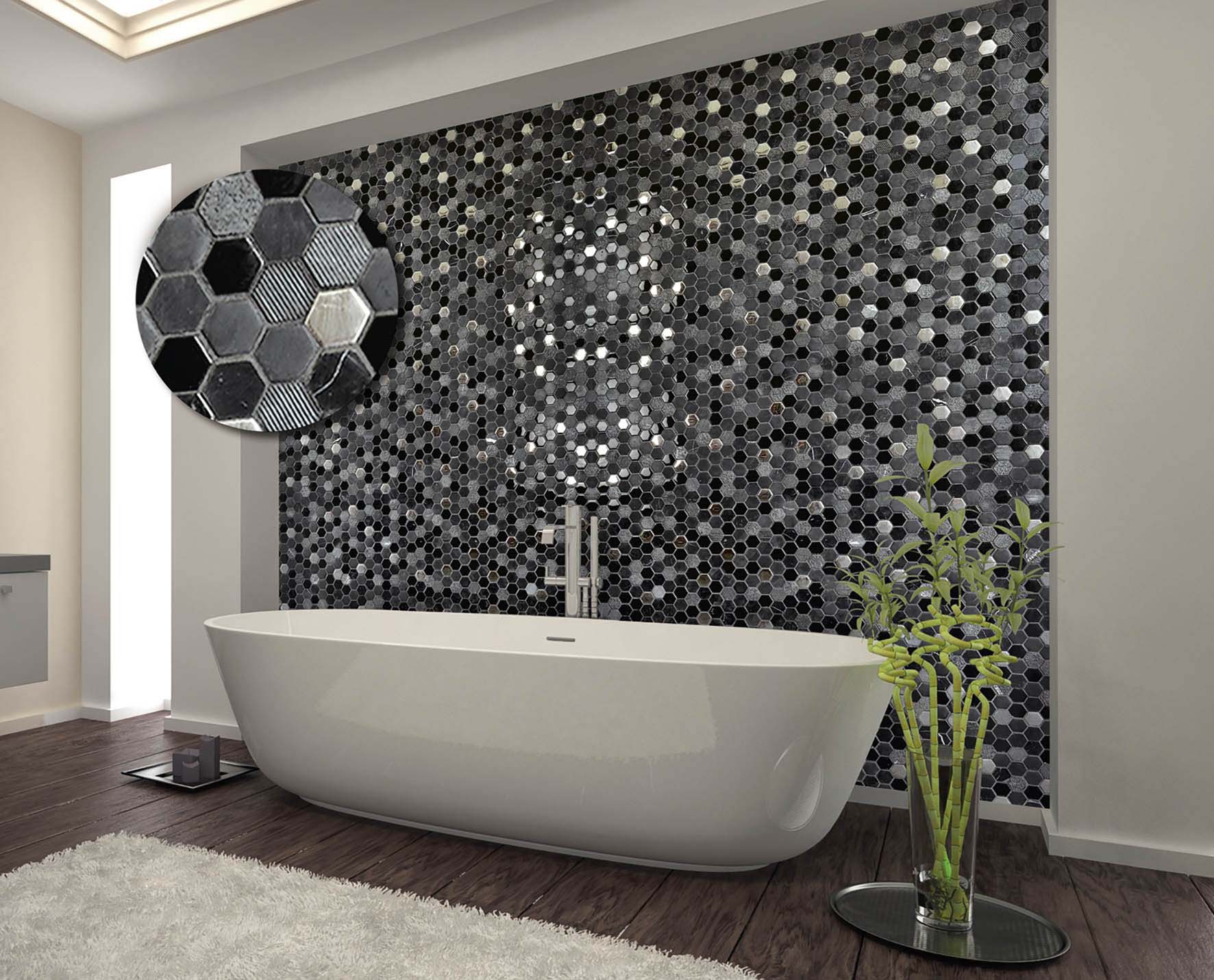 La serie Hexágono de revestimiento apuesta por teselas con esta forma geométrica combinando distintos materiales creando efectos brillo/mate. Producto apto para duchas. Al ser una malla puede adaptarse a todo tipo de formas curvas.