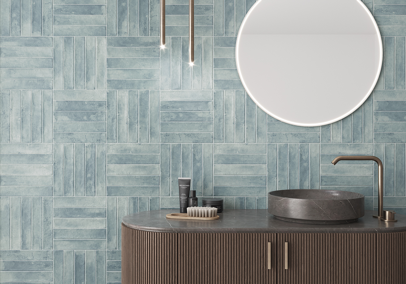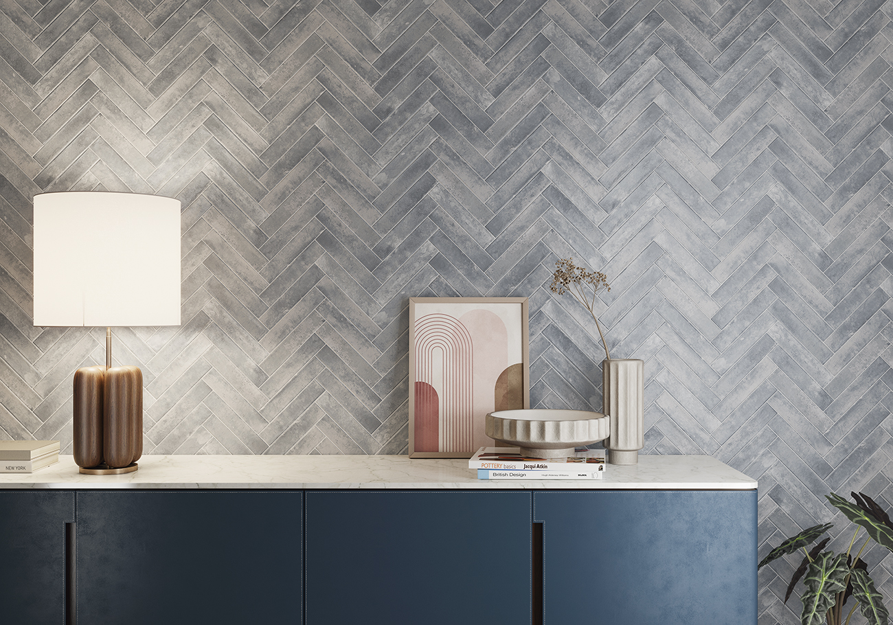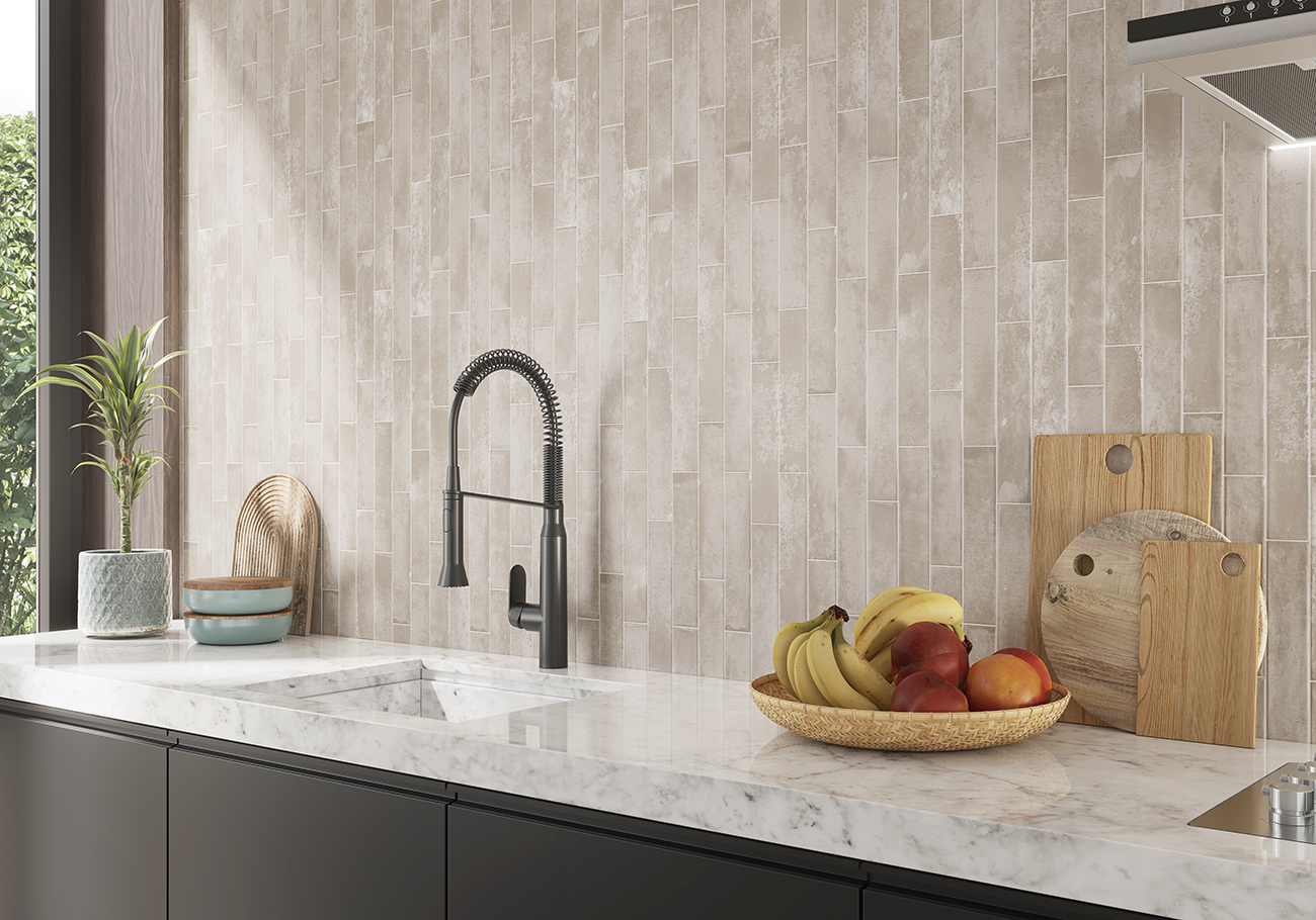 El formato estilizado de 5×25 cm permite composiciones dinámicas y versátiles: desde el clásico patrón tipo metro hasta colocaciones verticales, en espiga o combinaciones asimétricas que realzan tanto lo moderno como lo artesanal. Aunque no es un producto rectificado, su precisión dimensional asegura una instalación fluida y coherente, con juntas finas que no interrumpen la continuidad visual.