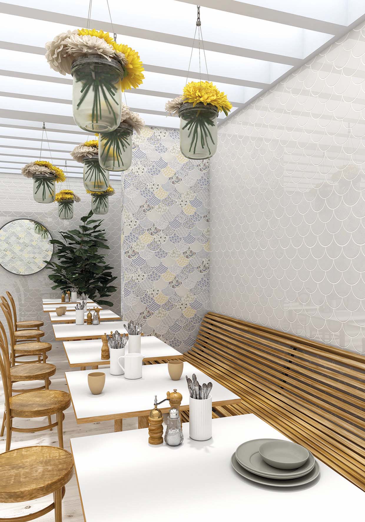 Esta serie de azulejos de revestimiento para baño y cocina apuesta por una forma irregular con curvas. Con esta nueva forma que imita “la escama de peces”, quisimos recordar la baldosa tradicional de inspiración marroquí pero con tonos suaves y delicados diseños de decoraciones. Creemos que este nuevo formato nos brindará nuevas oportunidades para seguir ofreciendo un diseño e inspiración creativos. Esta colección tiene 7 colores lisos y 13 decorados y su uso es solo como revestimiento.