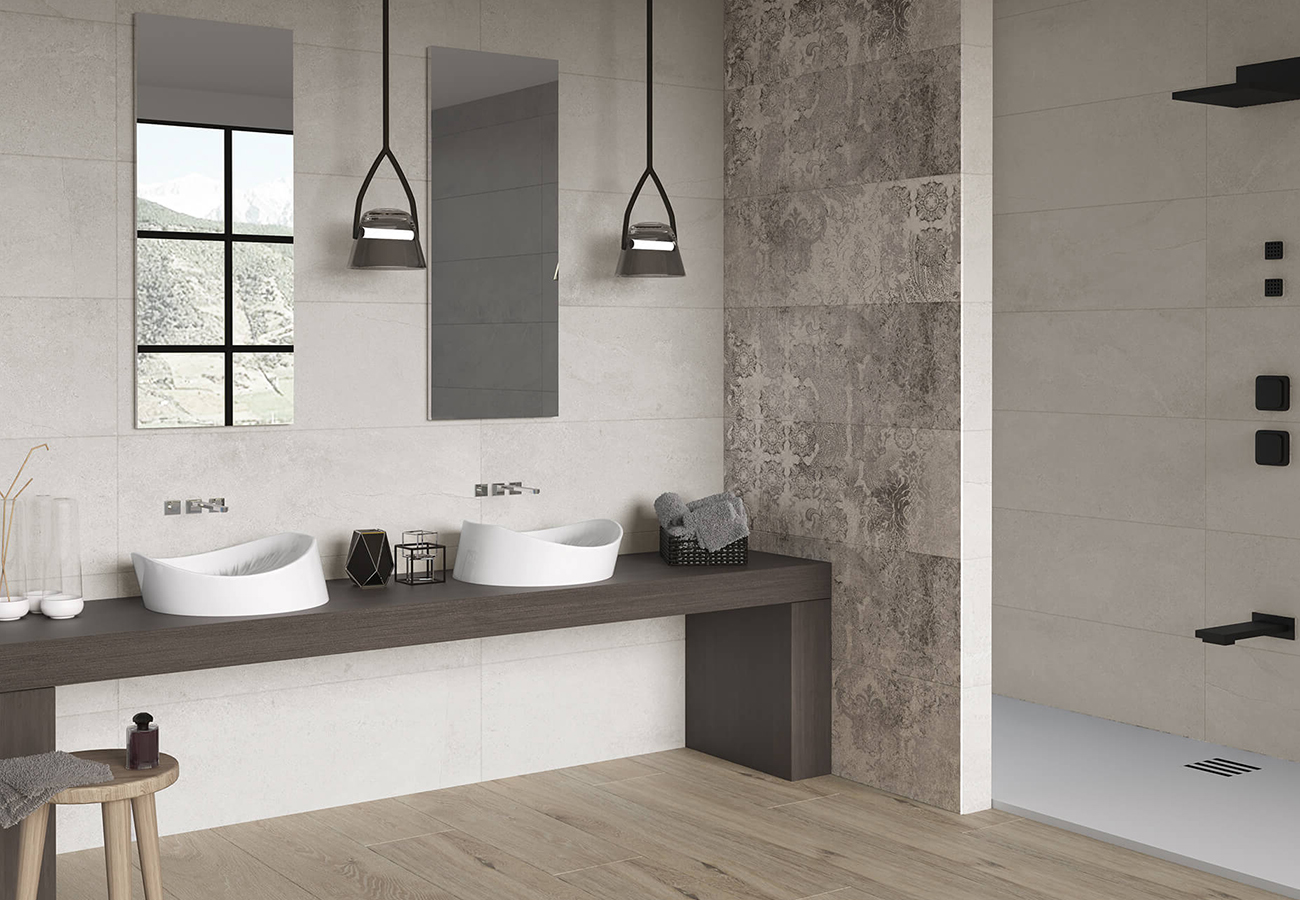 Este revestimiento se puede combinar con el pavimento recomendado Kamen en formato 60,8×60,8 cm, creando una continuidad estética entre el revestimiento y el pavimento. Además, el Kamen Perla se adapta perfectamente a otros productos de la colección Kamen, como el Kamen Marfil Normal y el Kamen Relieve Marfil, permitiendo crear espacios únicos y personalizados.