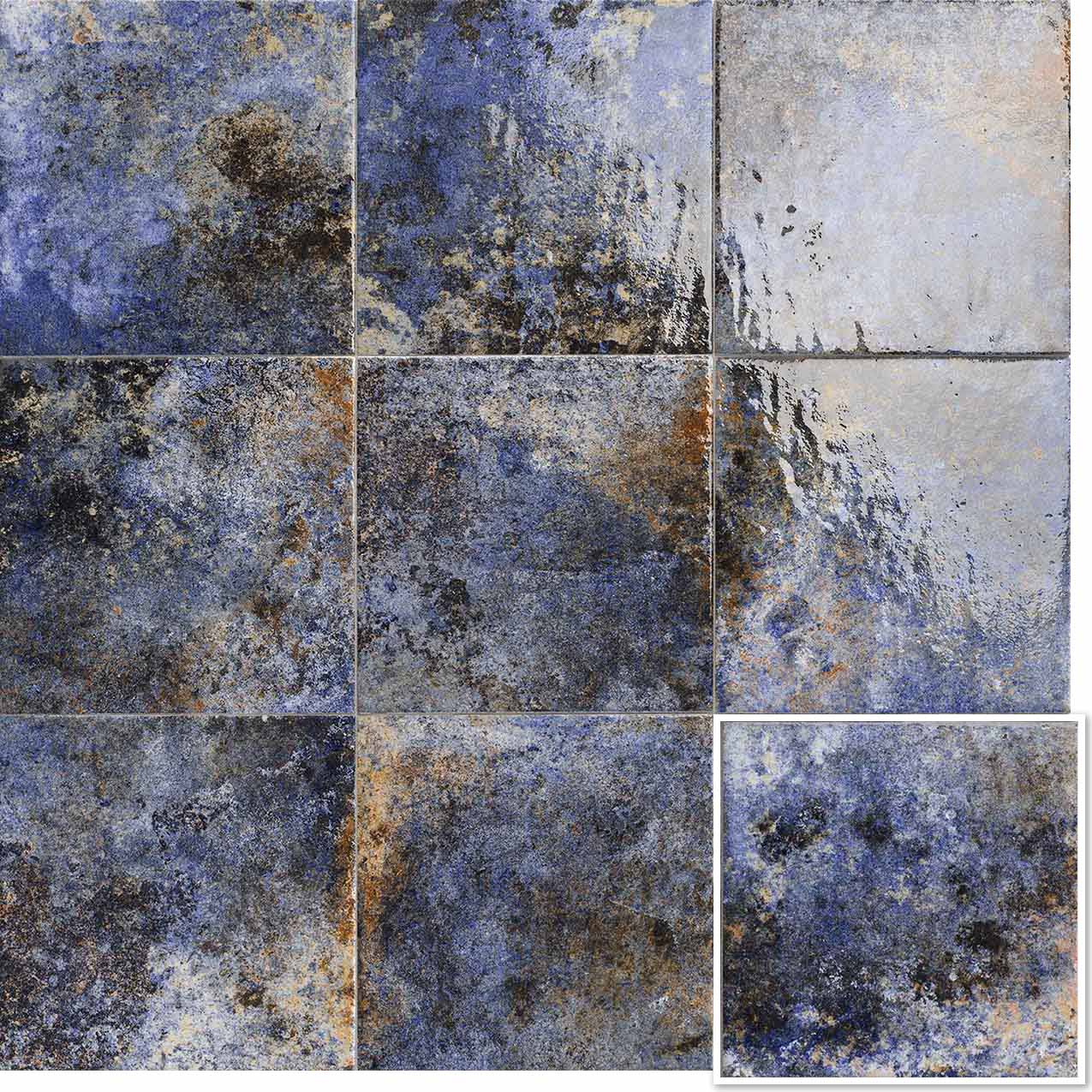 Esta serie de azulejos apuesta por texturas desgastadas creando destonificaciones evitando repeticiones de la gráfica, recordando al azulejo artesanal.