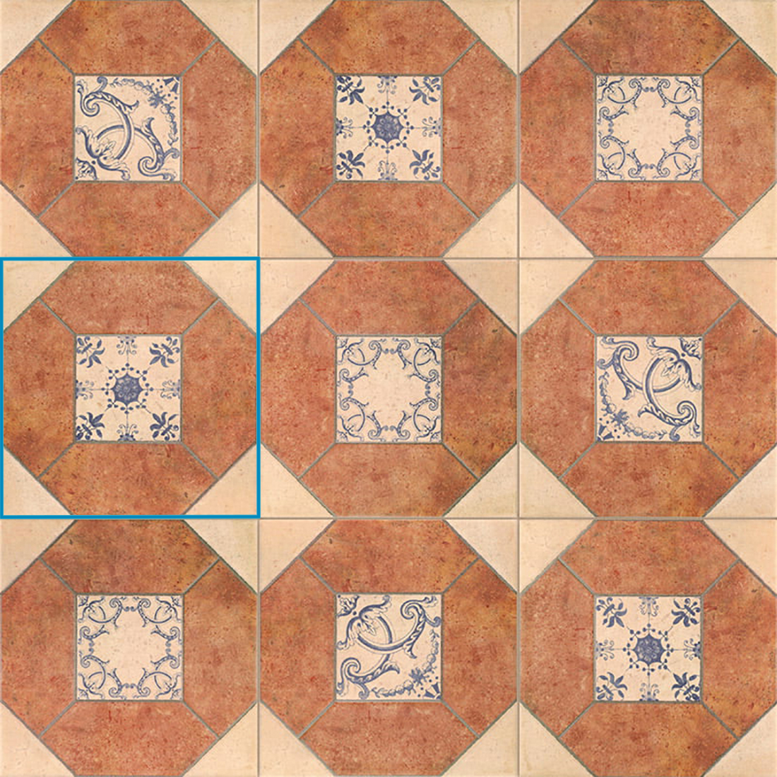 Crema, cotto, azul
