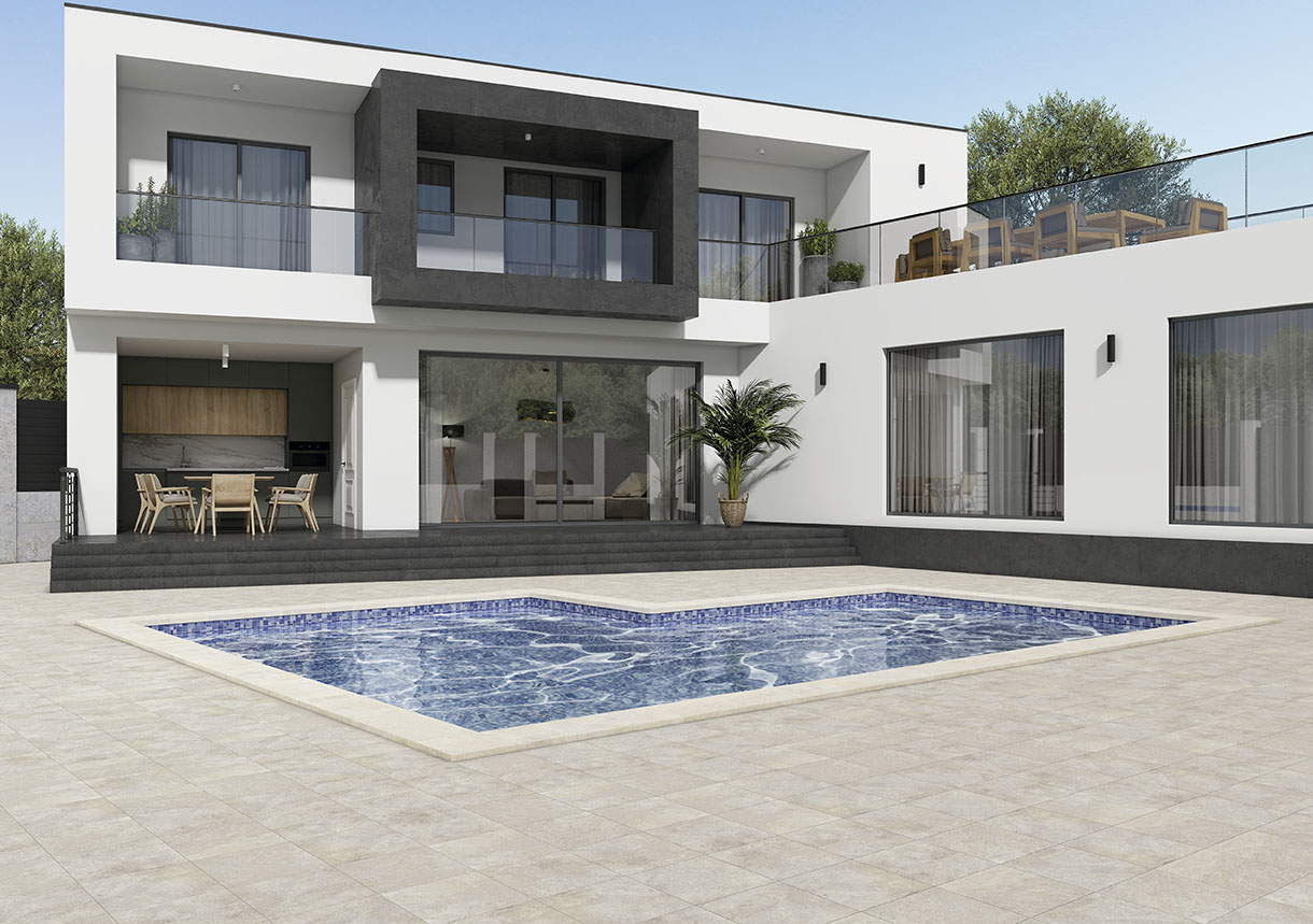 La serie Ibiza de pavimento porcelánico ofrece un acabado piedra mate sobre un ligero relieve con una superficie antideslizante que lo hacen ideal para exteriores. Disponible en dos tonos, gris y crema, cuenta con 12 caras diferentes muy homogéneas evitando así la repetición de la gráfica.