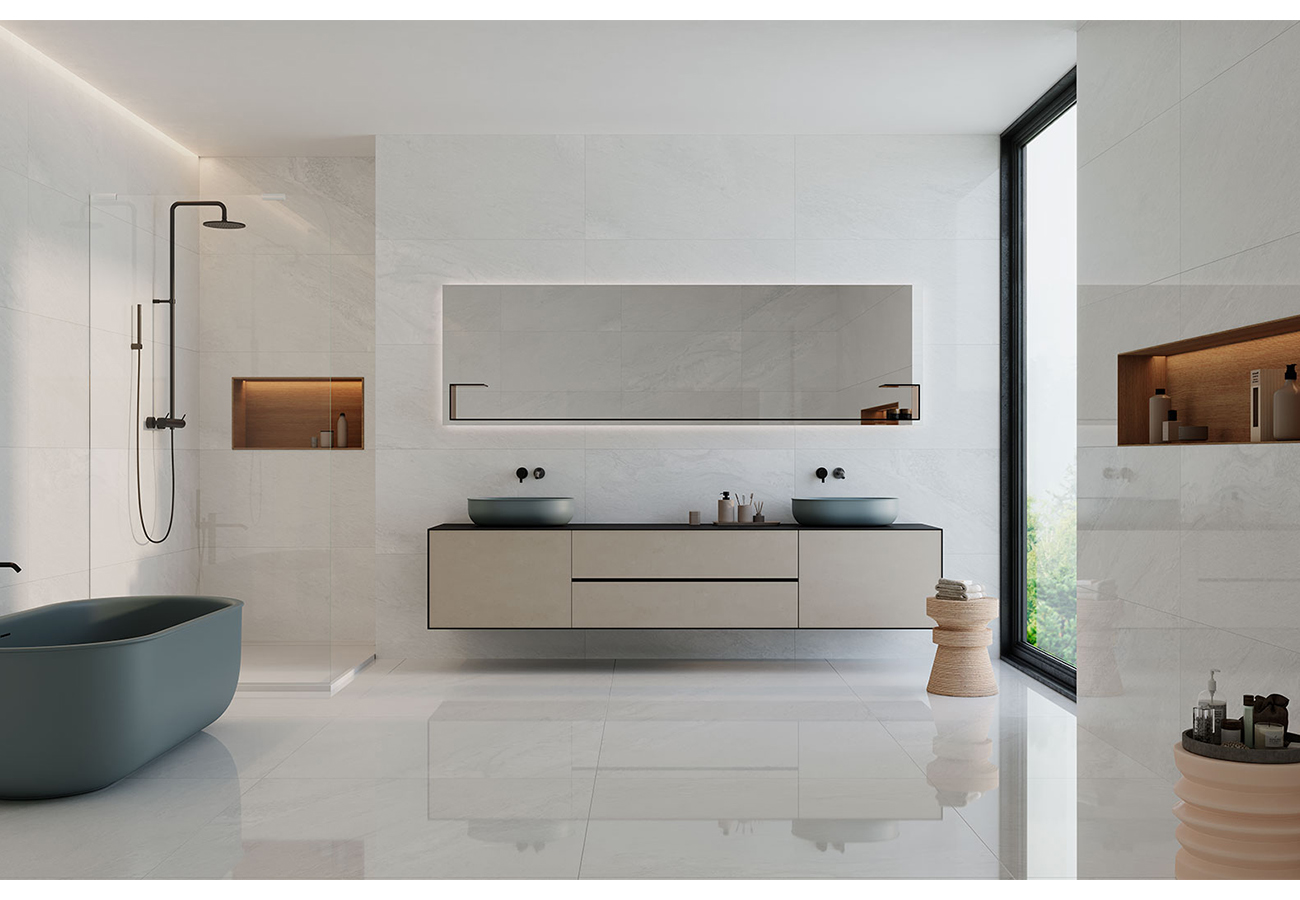 Piazza Polar destaca por su tono frío y luminoso, que aporta una sensación de amplitud y frescura a los espacios. Su acabado brillante refleja la luz, creando ambientes sofisticados y contemporáneos. Este porcelánico es especialmente adecuado para interiores modernos, donde la luminosidad y la estética minimalista son prioritarias.