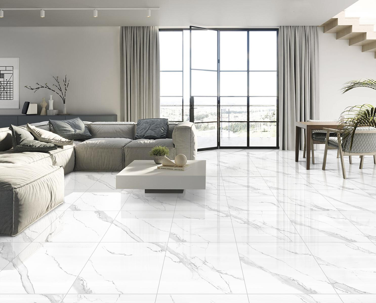 El acabado Pulido Rectificado asegura que cada baldosa de 60×60 cm ofrezca el mismo brillo de espejo y la posibilidad de instalación con junta mínima que su versión en gran formato, garantizando una transición visual fluida entre diferentes áreas de la vivienda.