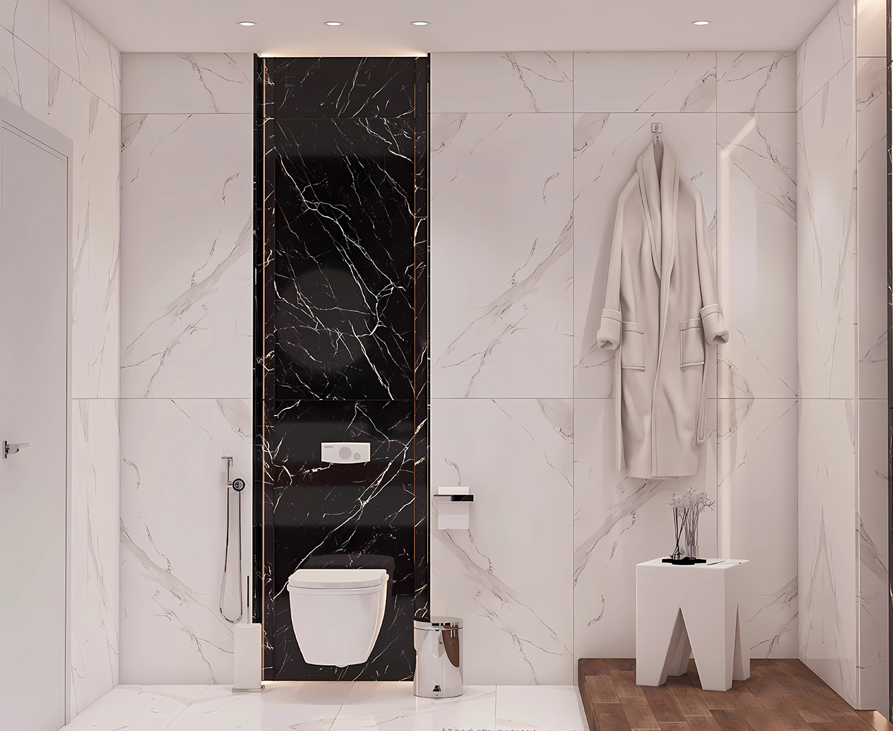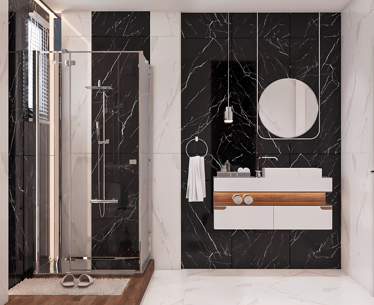 - Revestimiento Audaz: En baños y cocinas, utilizado como revestimiento, especialmente en duchas o paredes de acento, el CARRARA BLACK se combina a menudo con porcelánicos blancos (como el BOLONIA BLANCO 60×120) para crear un contraste clásico y atemporal.