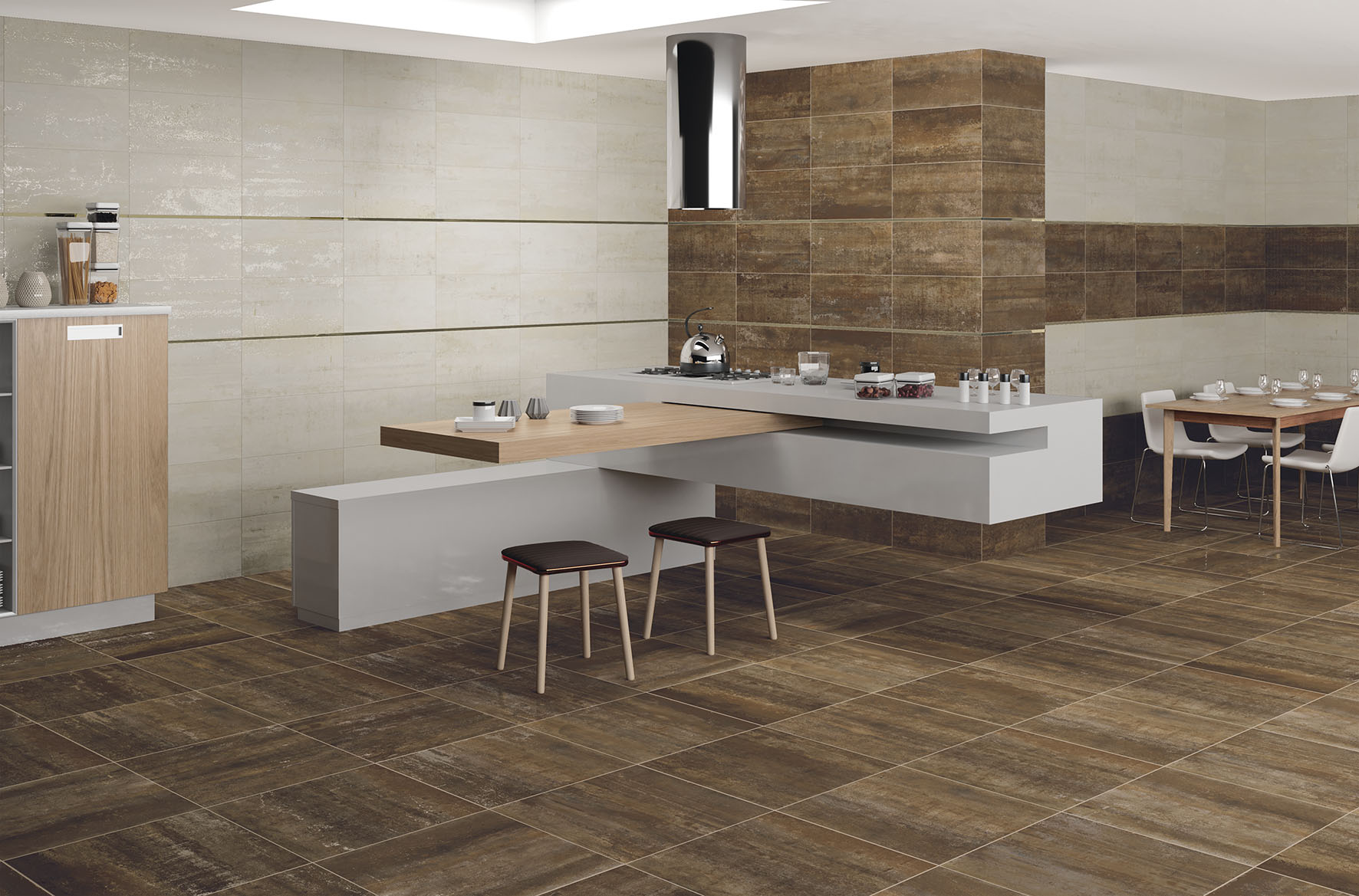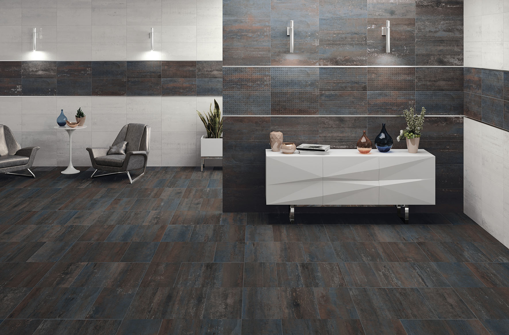 La serie Porcelánico metalic apuesta por una estética desgastada e industrial pero a su vez elegante, disponible en tonalidades diferentes para adaptarse a la estética del entorno y al gusto del cliente.