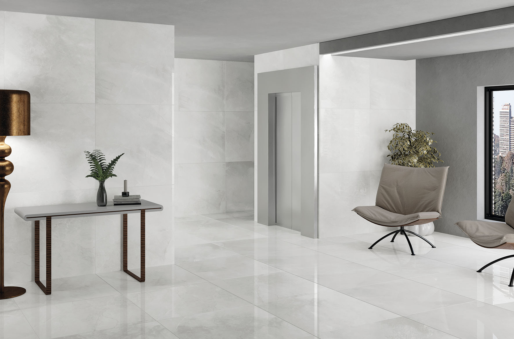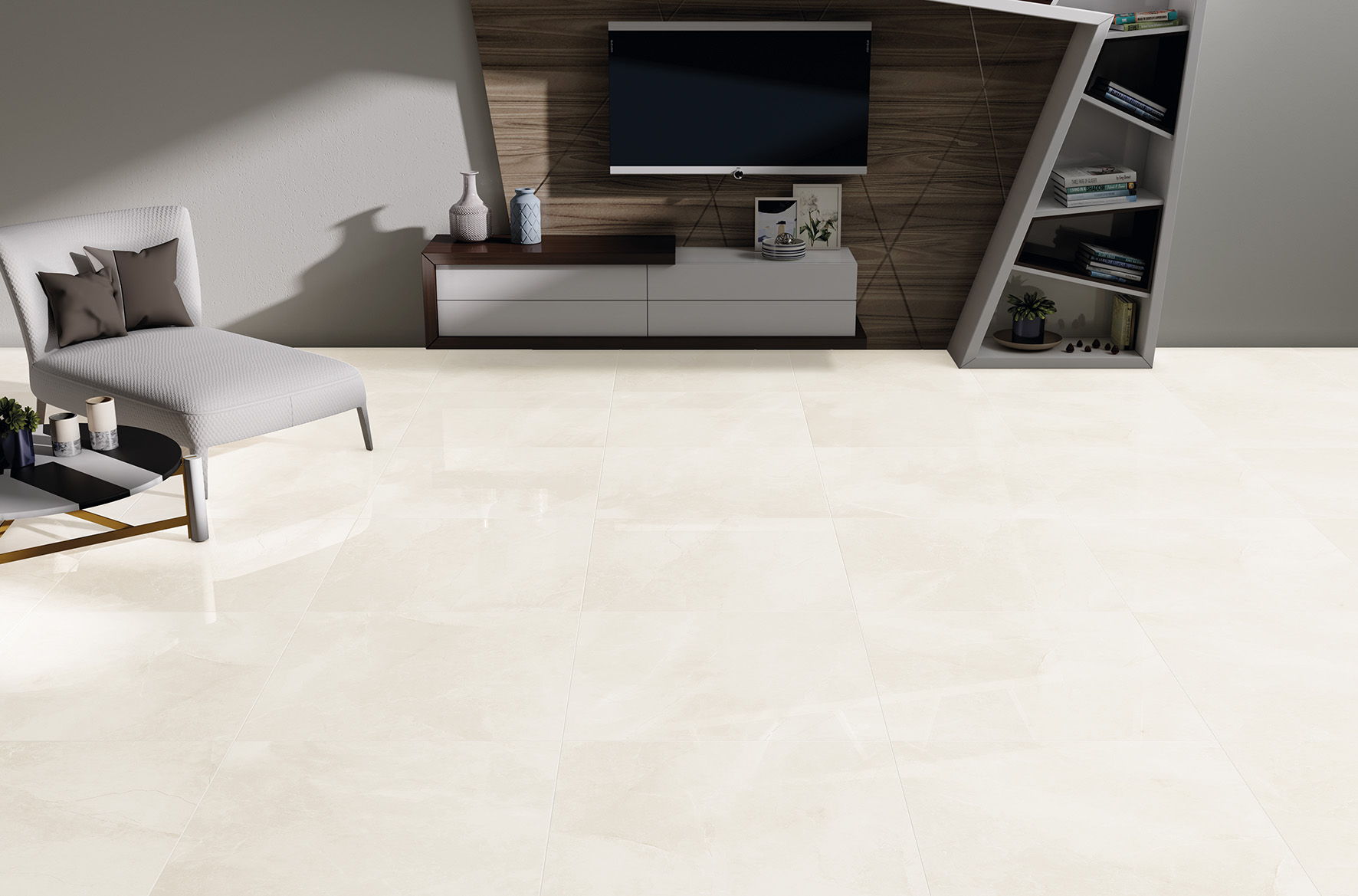 La serie de azulejo porcelánico Niza 90×90 es un pavimento elegante de gran calidad ya que se trata de un porcelánico rectificado pulido imitación mármol muy homogéneo en su gráfica, de forma que el conjunto es visualmente agradable junto a esos dos tonos suaves a elegir: marfil y perla. Su gran formato lo hace apto para espacios amplios y luminosos, en los que su acabado pulido destaca especialmente.
