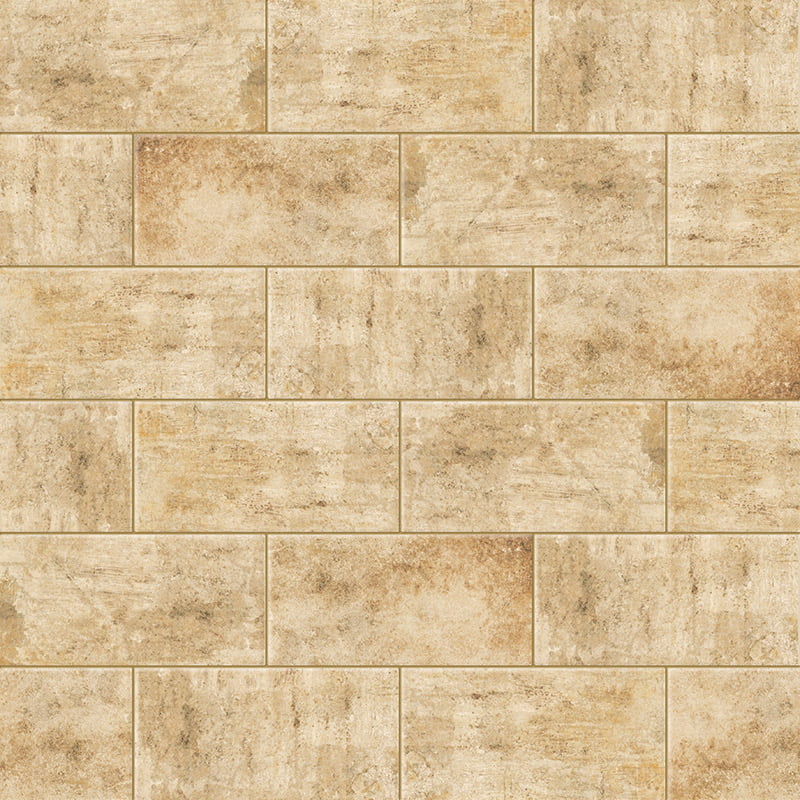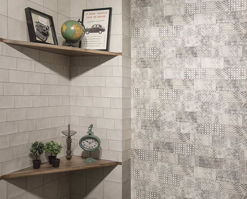 Serie de azulejos para baño y cocina de colores naturales con decoración con motivos geométricos de aspecto desgastado.
