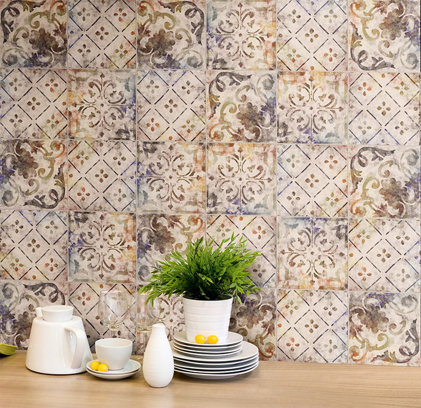 Serie de azulejos para baño y cocina de colores naturales junto a tonos más atrevidos en la decoración con motivos ornamentales de aspecto desgastado.