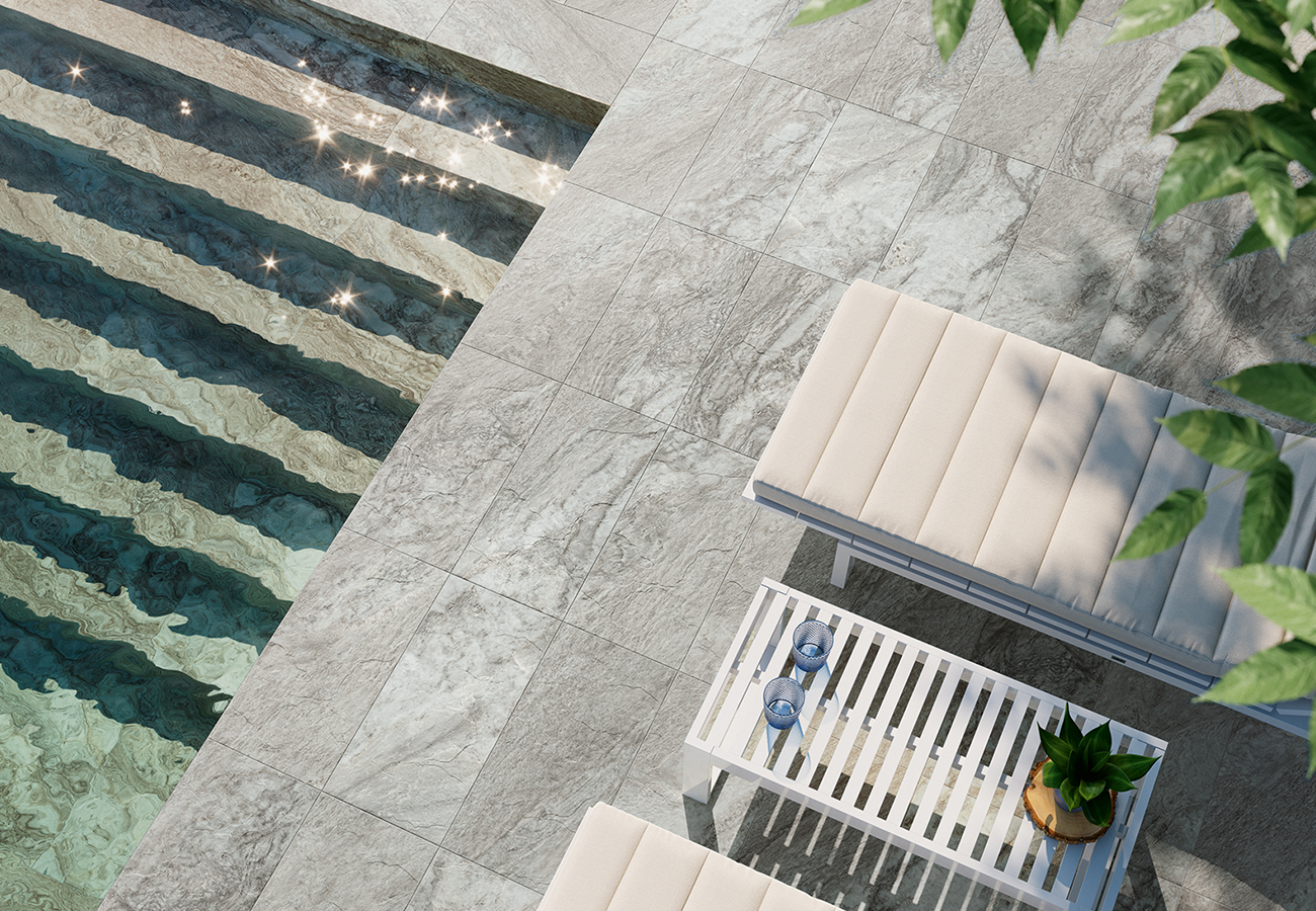 La serie Sagano también incluye piezas especiales, como rodapié y peldaño, que permiten una instalación completa y armónica. Estas piezas no solo complementan el diseño del pavimento, sino que también facilitan una transición elegante entre las superficies y las paredes, así como en escaleras y bordes.