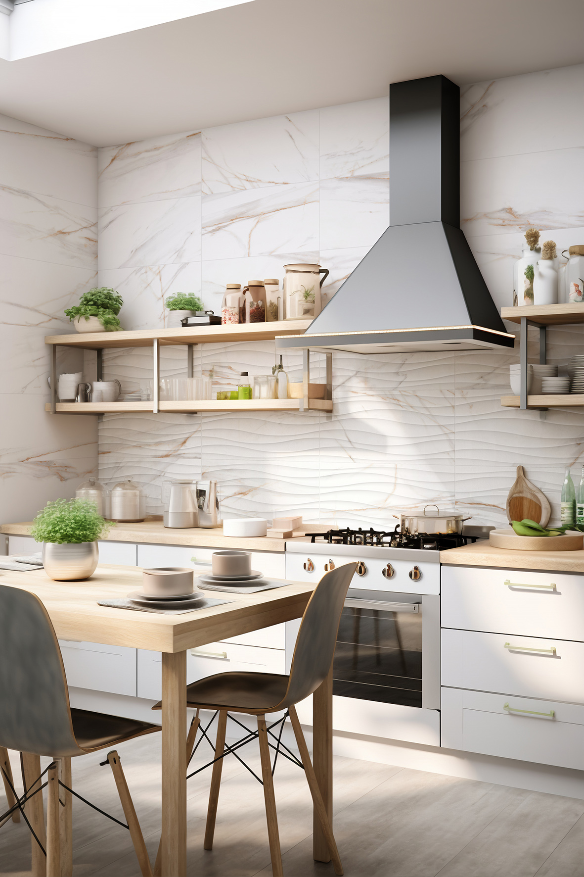 Revestimiento (Paredes Especializadas): Para las paredes, la colección amplía sus posibilidades con formatos de 30×90 cm y 30×60 cm, incluyendo piezas decorativas con texturas tridimensionales: