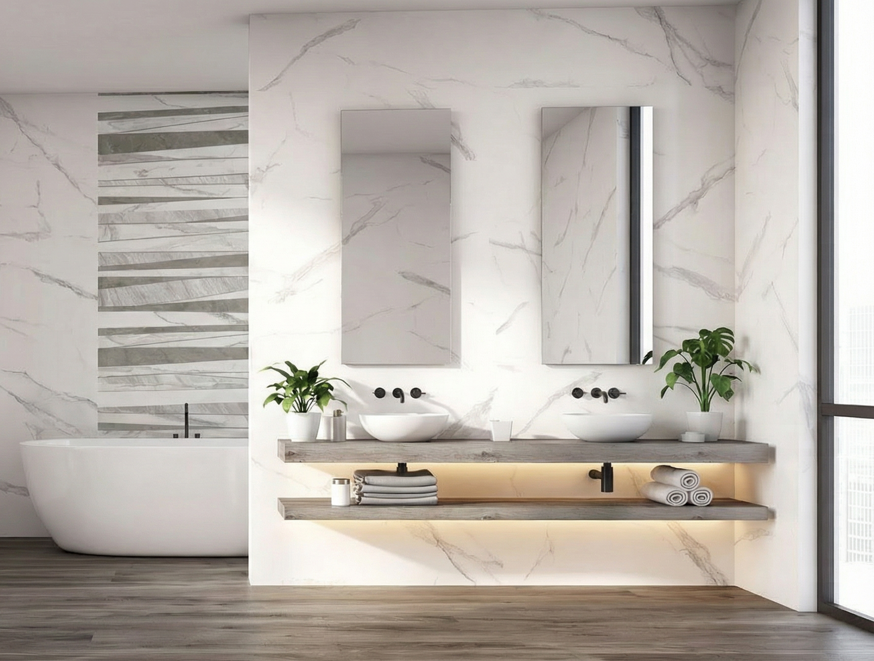 El Tebas Gris es un azulejo porcelánico de gran formato (30×90 cm) con un acabado rectificado, lo que permite una instalación más fácil y precisa al reducir el tamaño de las juntas visibles. Este modelo destaca por su color gris suave y su acabado que simula el mármol, lo que lo convierte en una excelente opción para aportar elegancia y sofisticación a cualquier espacio.
