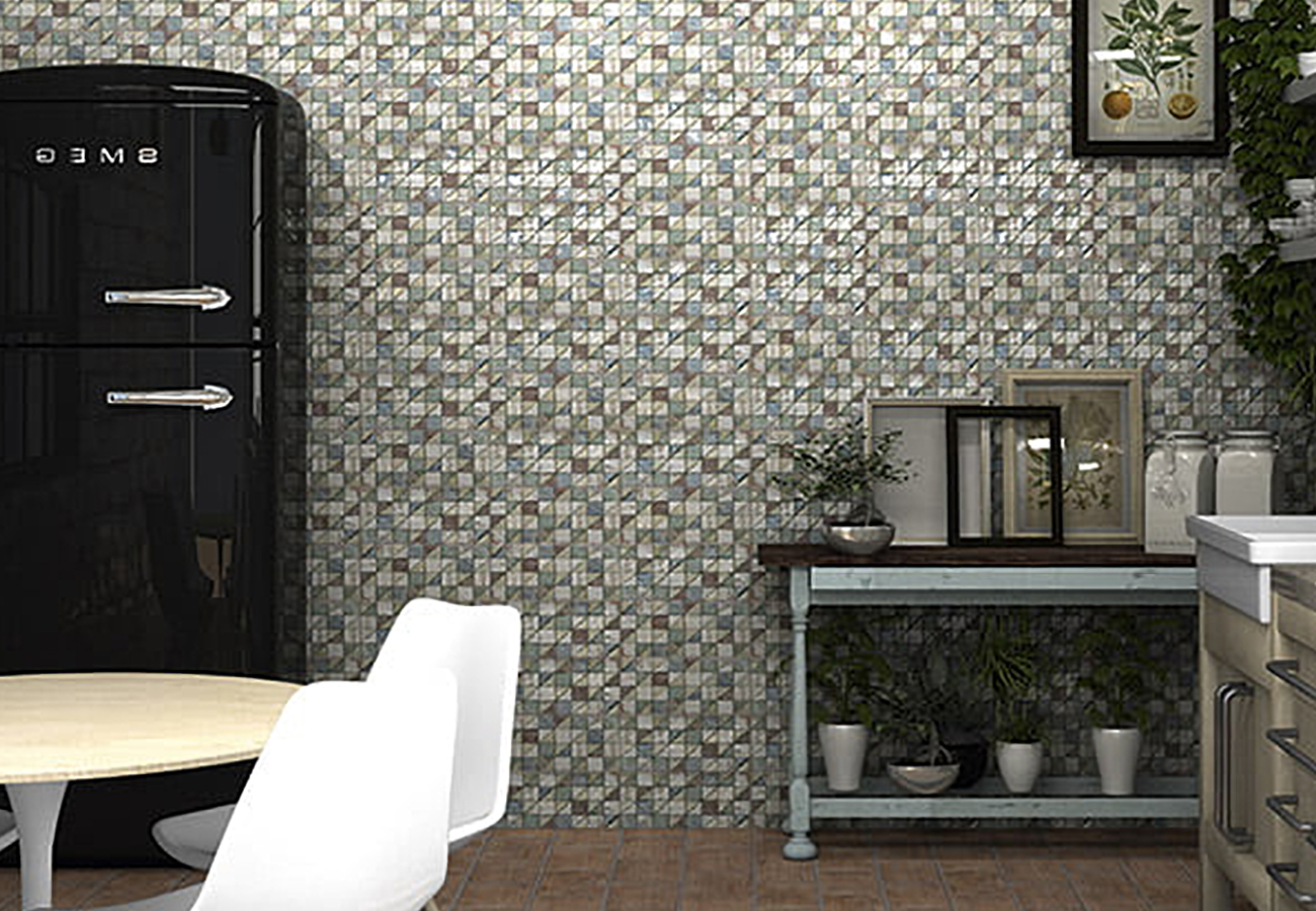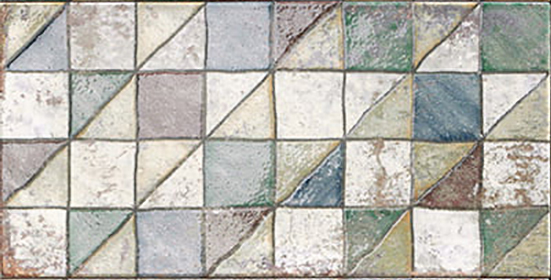 El Totto Deco Atelier 15×30 de Mainzu es un azulejo decorado de pasta roja, ideal para quienes buscan un revestimiento con un aire vintage y artesanal. Su diseño geométrico, con pequeñas baldosas triangulares en tonos azul, verde, marrón y crema, crea un mosaico visual dinámico y lleno de personalidad, perfecto para baños, cocinas y espacios interiores.