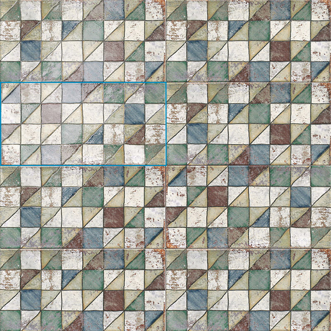 Fabricado en pasta roja, este azulejo destaca por su acabado brillo, que acentúa la riqueza cromática de su diseño en tonos tierra, azulados y verdes, logrando un efecto visual vibrante y atemporal. Su destonificación V3 aporta variaciones en la tonalidad y textura de cada pieza, ofreciendo un acabado artesanal que evoca la cerámica envejecida.