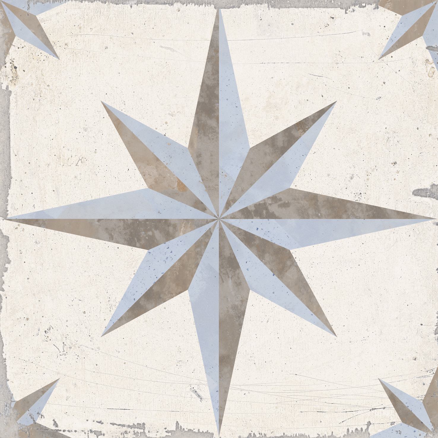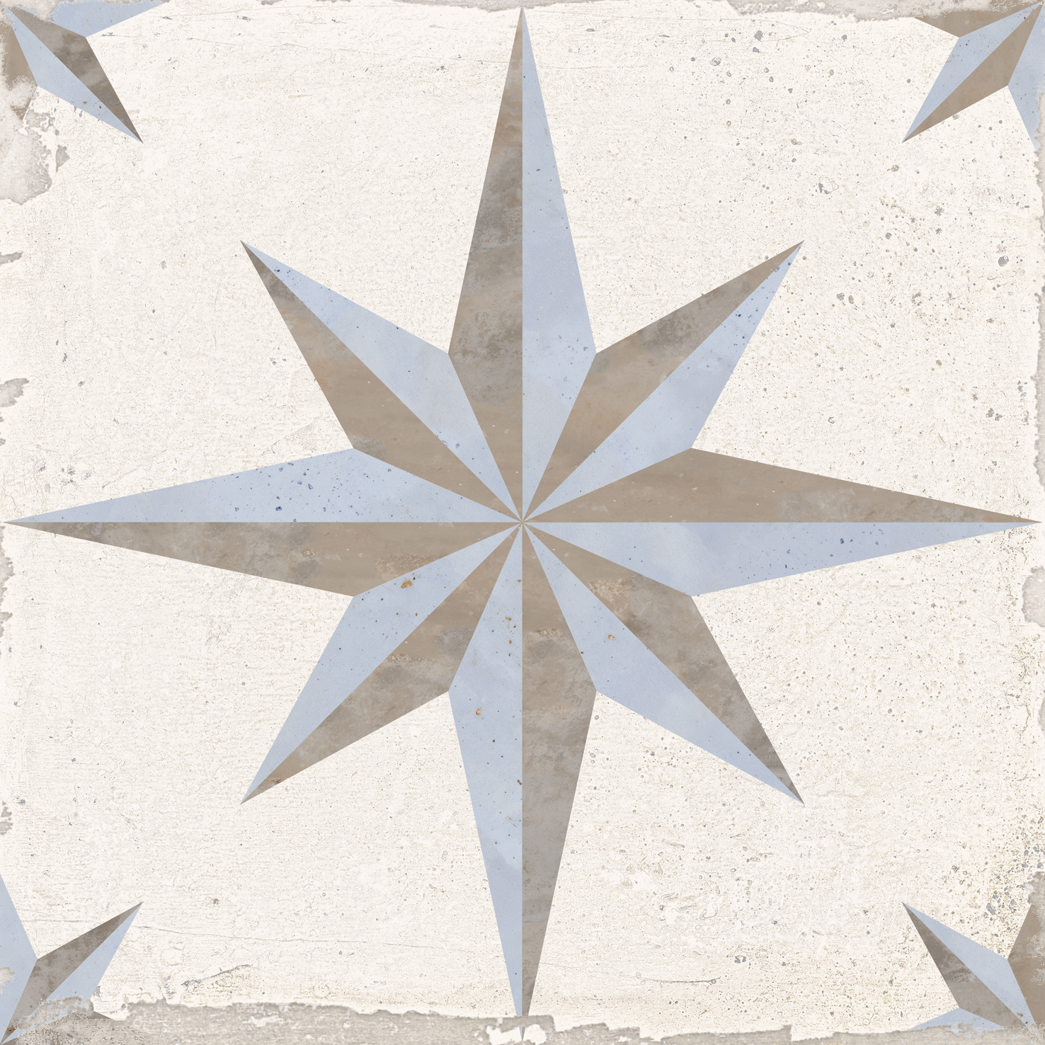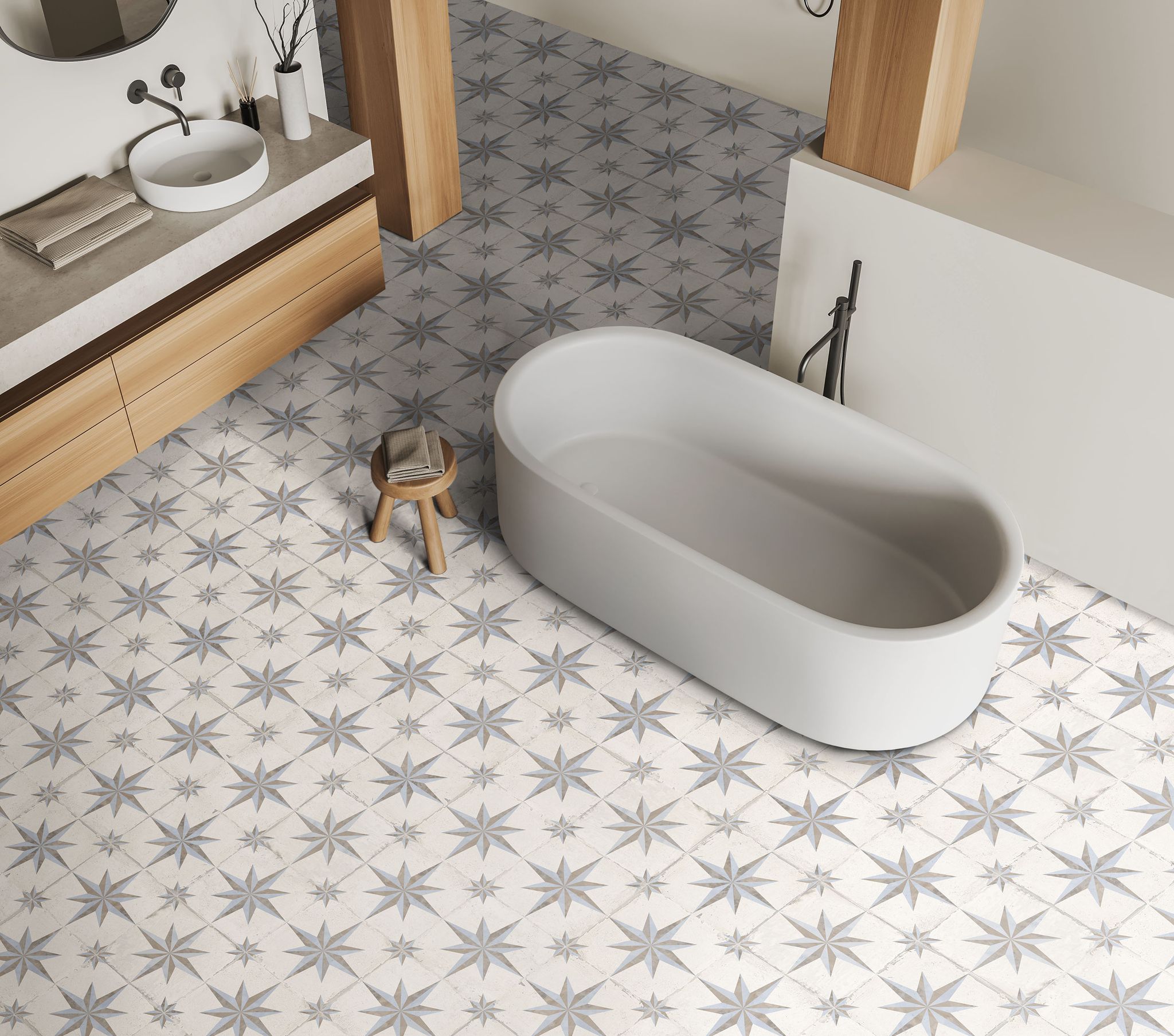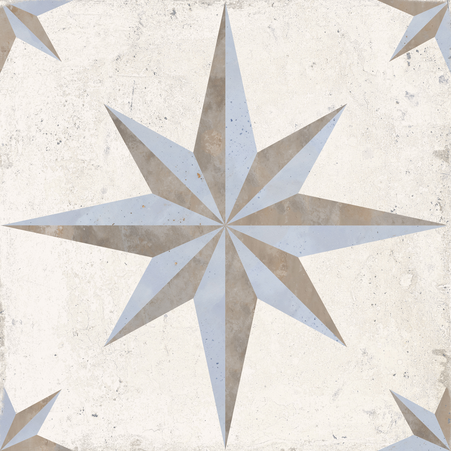 Vichy Sol es un porcelánico en formato 25×25 cm con acabado mate. Su diseño de estrellas en tonos beige, grises y azules crea un ambiente luminoso y fresco, ideal para suelos de baños, cocinas y áreas comerciales que buscan un acabado elegante y alegre.