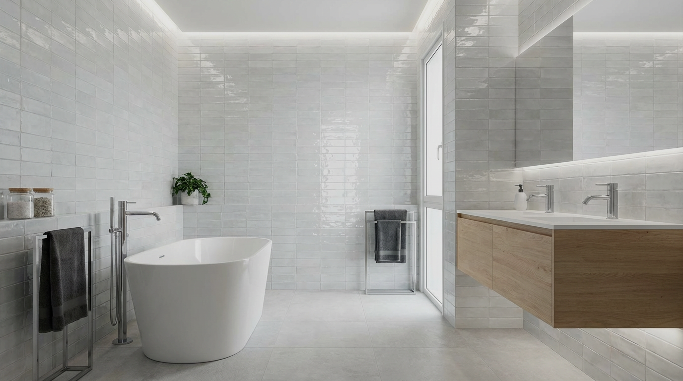 El formato 7.5×30 cm rectificado permite una instalación precisa, con juntas mínimas que ofrecen un acabado limpio y uniforme. Su acabado brillante resalta la luz, haciendo que el espacio se vea más grande y luminoso.